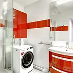 The apartment features a bathroom with hair dryers and towels. Furthermore, a separate toilet, a shower, and a washing machine is available.